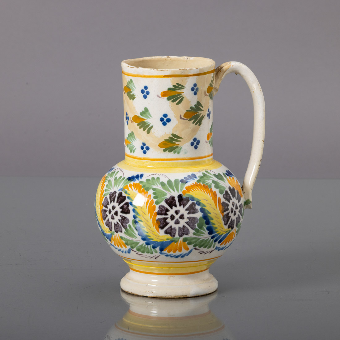 Em faiança portuguesa, decoração policromada com motivos florais. Séc. XIX. Pequenas esbeiçadelas e restauro na boca.