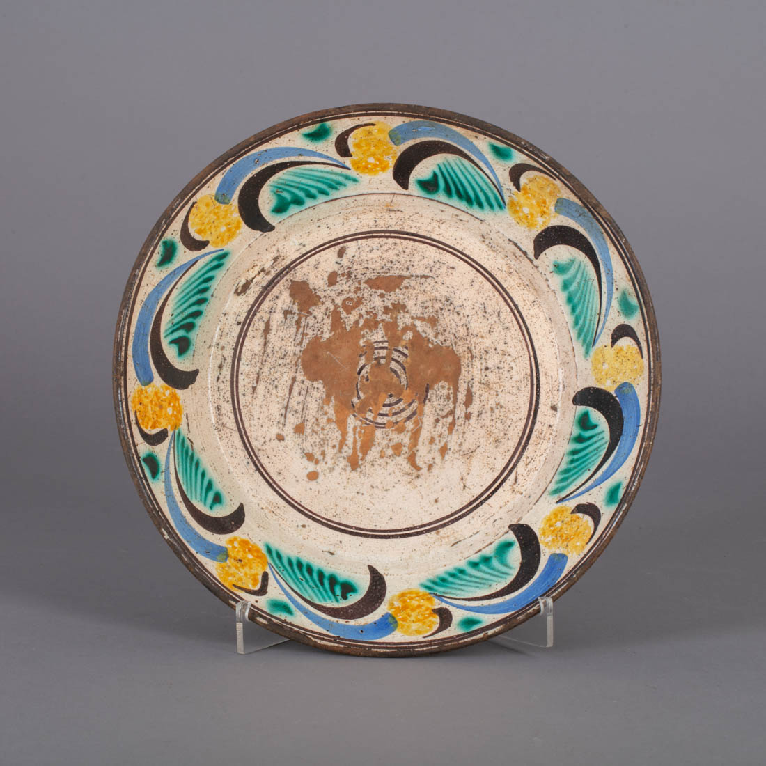Em faiança portuguesa de Coimbra dita "Ratinho", Séc. XIX, decoração policromada. Desgaste.