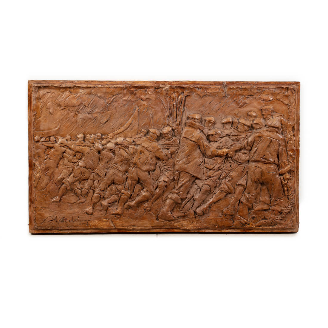 Placa em gesso relevado, representando regresso da faina, assinada e datada de 2008. Falhas, cabelos e pequenos defeitos.
