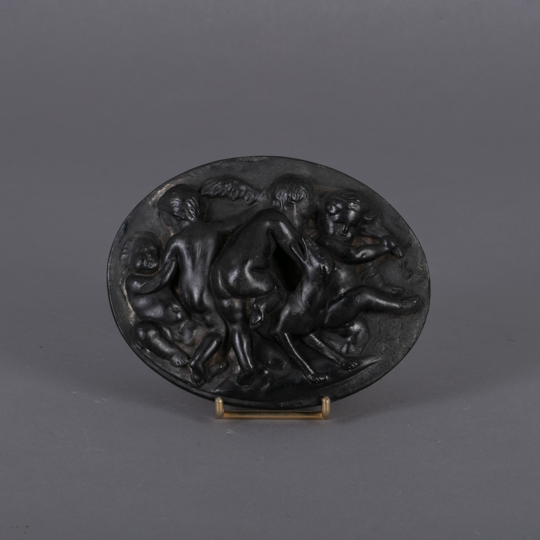 Placa oval em gesso relevado e pintado, assinada. Sinais de uso, restauro.
