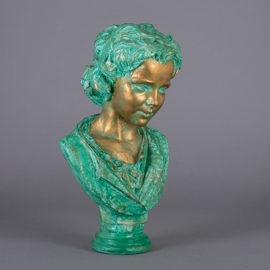 Escultura em gesso patinado a verde e dourado, assinado e datado 1878. Pequenas falhas.