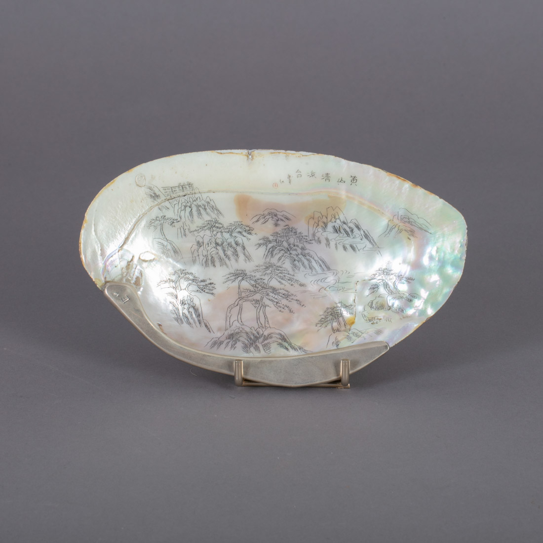 Concha em madrepérola incisa "paisagem oriental" e caracteres, aplicação em prata portuguesa contraste águia (1938-1984) de 833, marcada "LF" e de ourives de Venâncio Pereira, Lda. (1976). Leves falhas.