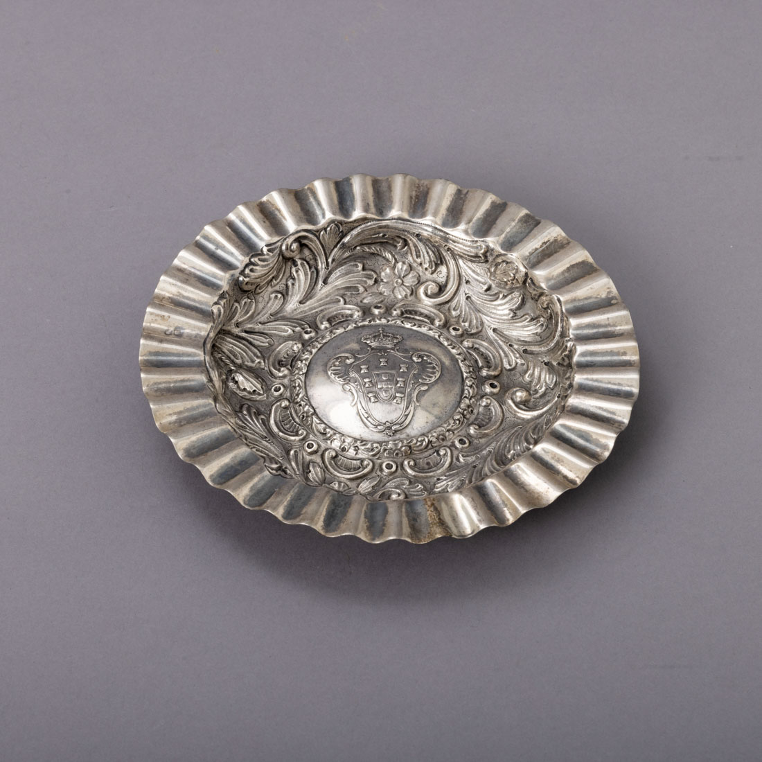 Em prata portuguesa contraste javali (1887-1937) de 833, decoração relevada com elementos vegetalistas. Sinais de uso.