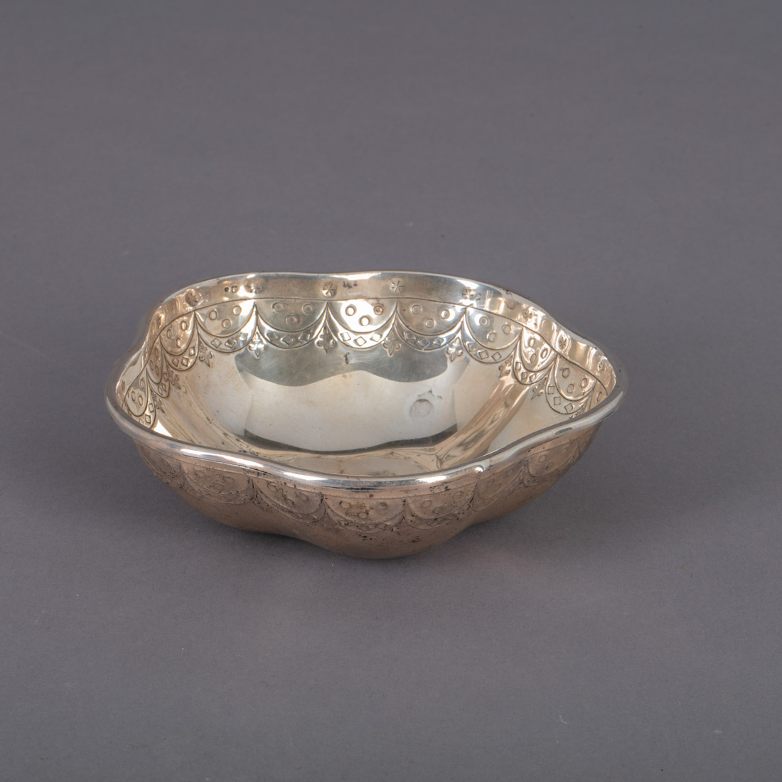 Em prata portuguesa contraste águia (pós 1985) de 925, decoração gravada com grinaldas. Sinais de uso, pequenas amolgadelas no bordo.