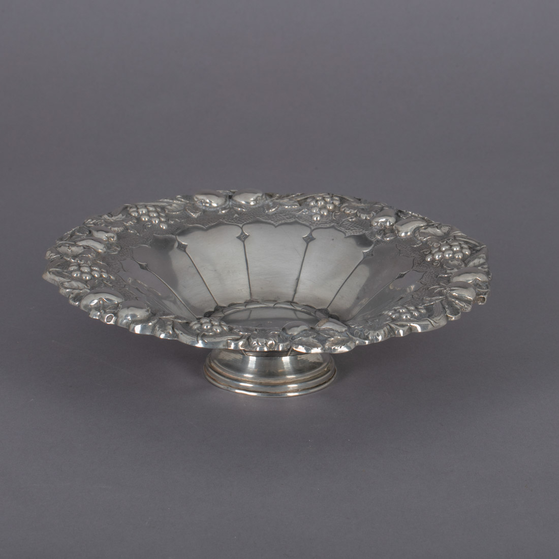 Em prata portuguesa contraste águia (1938-1984) de 833, decoração relevada com frutos e folhagem. Sinais de uso.