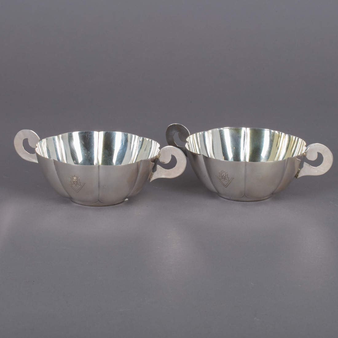 Em prata portuguesa decoração gomada e gravada "brasão". Sem marcas, ao abrigo do Decreto-Lei n.º 120/2017. Sinais de uso, uma com pequeno defeito junto à soldadura da asa.