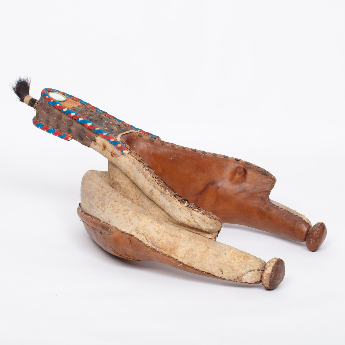 Em couro, outros materiais com ornamentos. Pequenas falhas e defeitos.