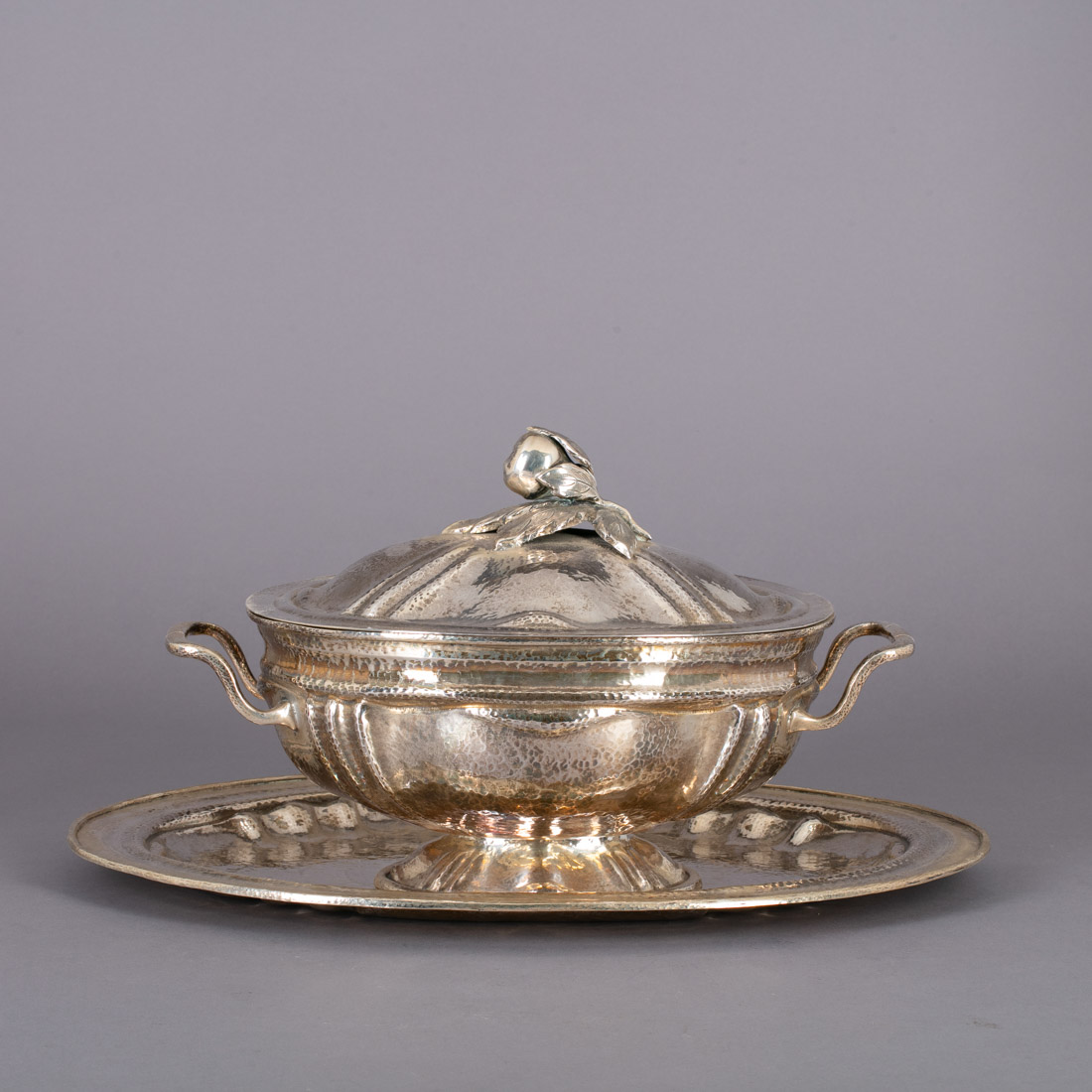 Em prata portuguesa contraste águia (1938-1984) de 833, marca de ourives do Porto, Fernando Paulino da Silva, decoração martelada, pomo relevado com fruto. Sinais de uso.