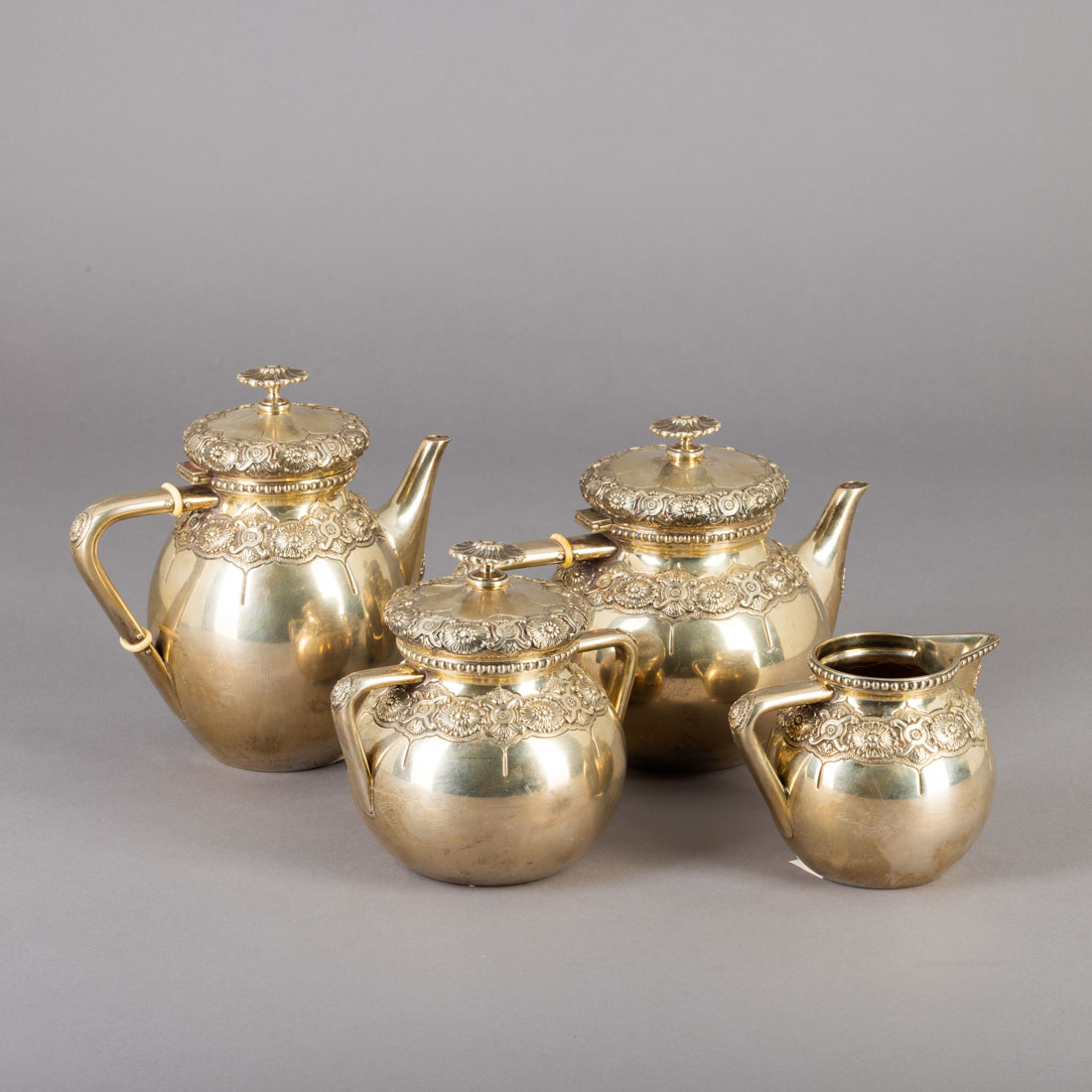 Em prata portuguesa contraste javali (1887-1937) de 833, marcada Reis Fos. Lda., Porto, decoração relevada "margaridas". Composto por bule, cafeteira. Leiteira e açucareiro. Sinais de uso, leves amolgadelas.