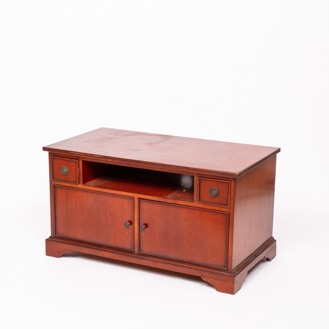 Folheada a mogno e outros madeiras, de duas portas e duas pequenas gavetas. Sinais de uso e pequenas falhas.
