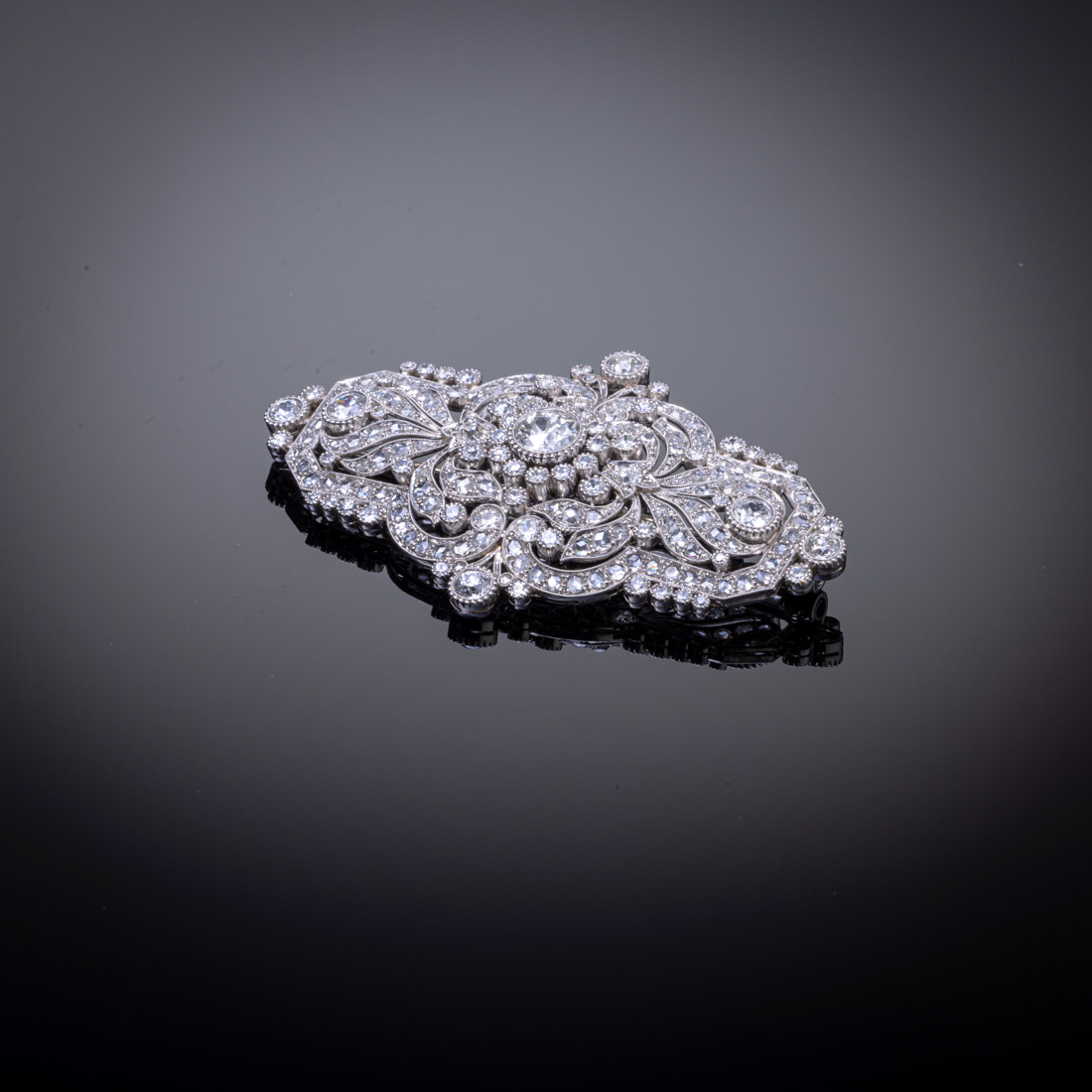 Em platina cravejada com diamantes em talhe antigo de brilhante e talhe rosa, com aprox. 4,5 ct. Séc. XX (1ª. Metade). Sem marcas, ao abrigo do Decreto-Lei n.º 120/2017. Sinais de uso.