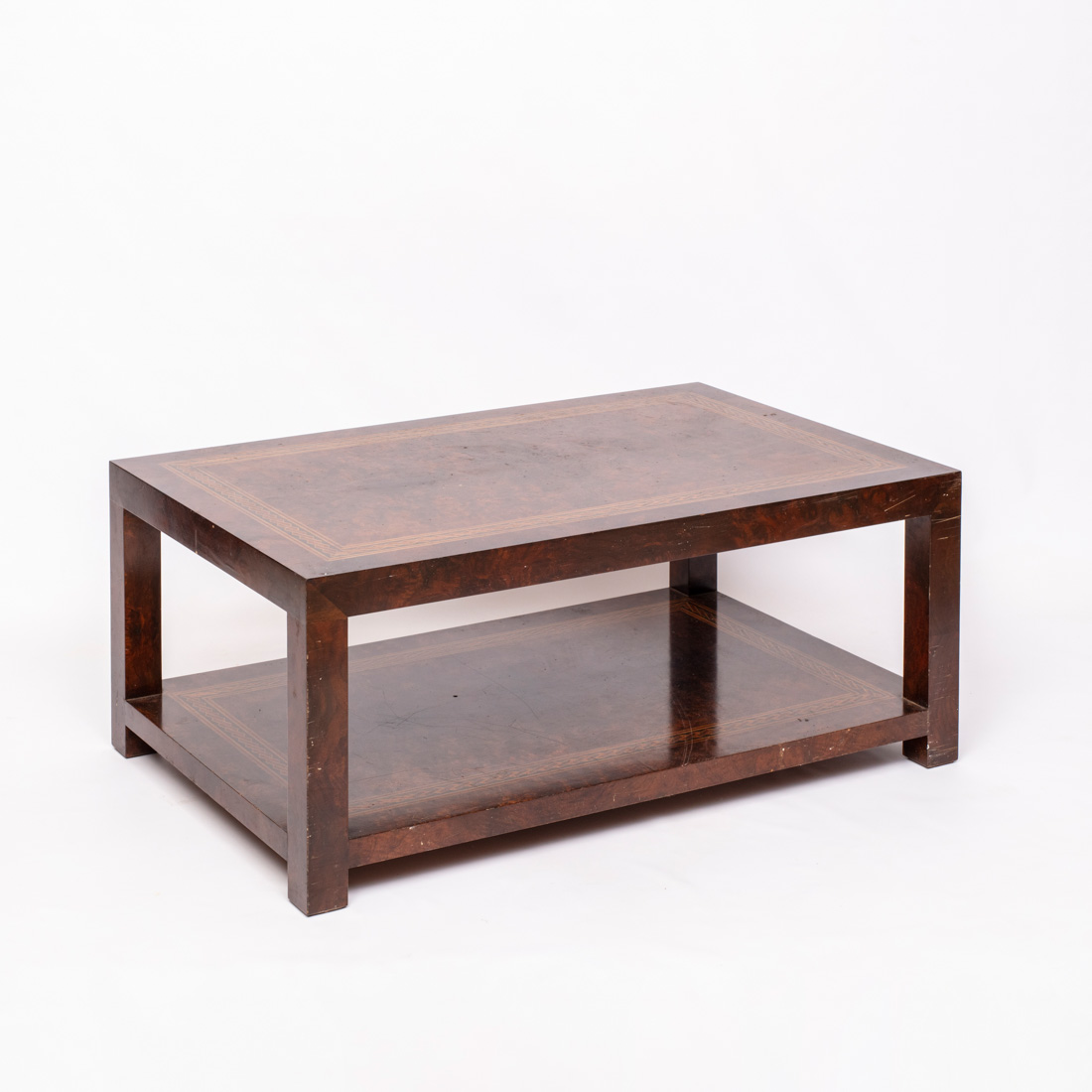 Folheada a raiz de nogueira e outras madeiras com embutidos geométricos. Falhas e pequenos defeitos.