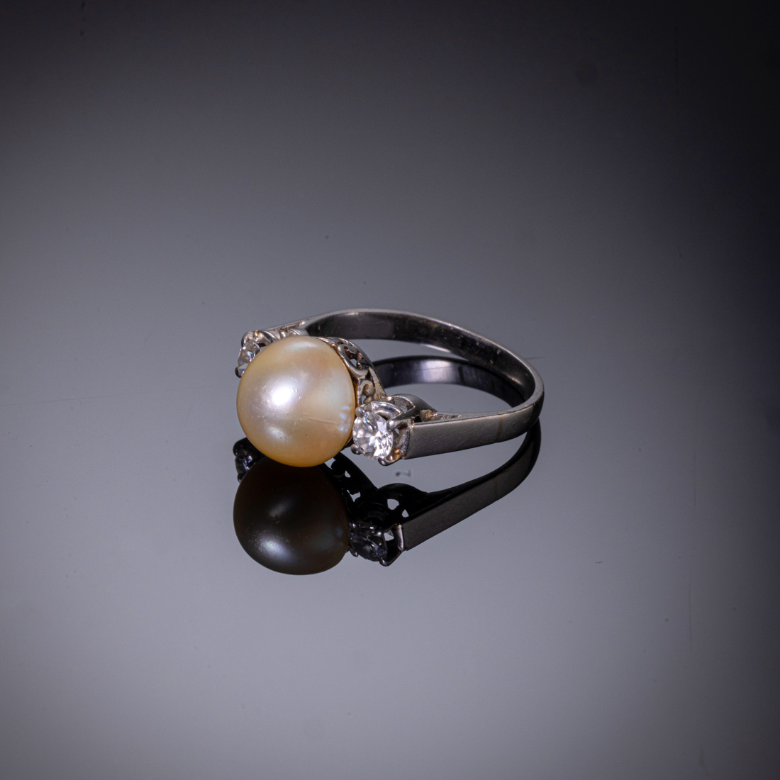 Em platina contraste cabeça de papagaio e galo (pós 1985) cravejado com dois diamantes talhe brilhante com aprox. 0,40 ct., e pérola natural (não testada). Sinais de uso.