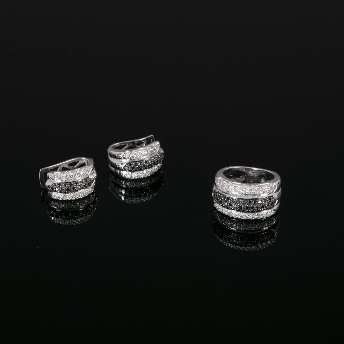 Em ouro branco português de 19,2Kt., contraste veado (pós 1985) cravejado com diamantes negros e incolores talhe brilhante. Sinais de uso.