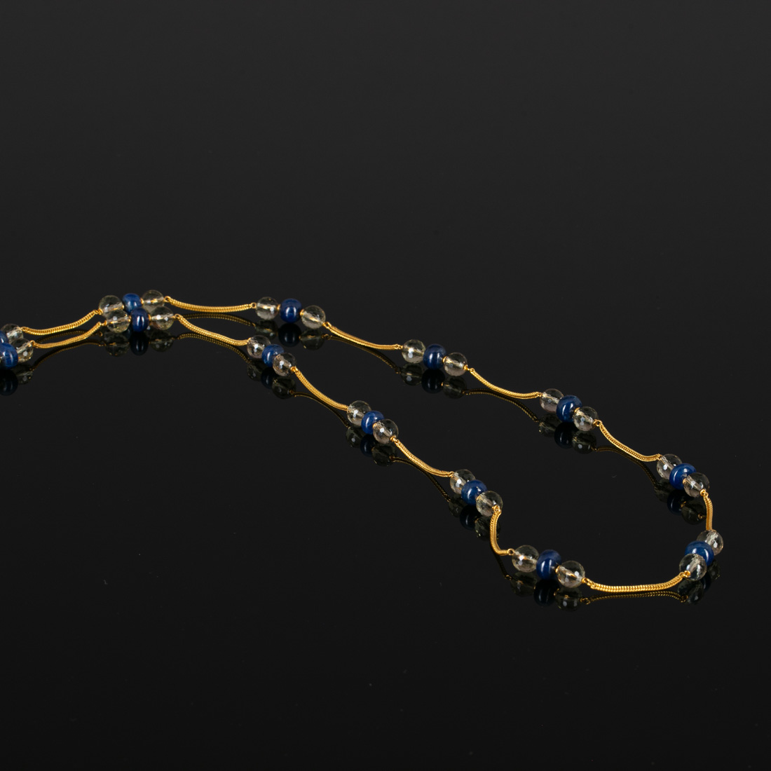 Em ouro português de 19,2Kt., contraste veado (pós 1985) em malha intercalado com contas facetadas em quartzo fumado e contas em raiz de safira. Sinais de uso.