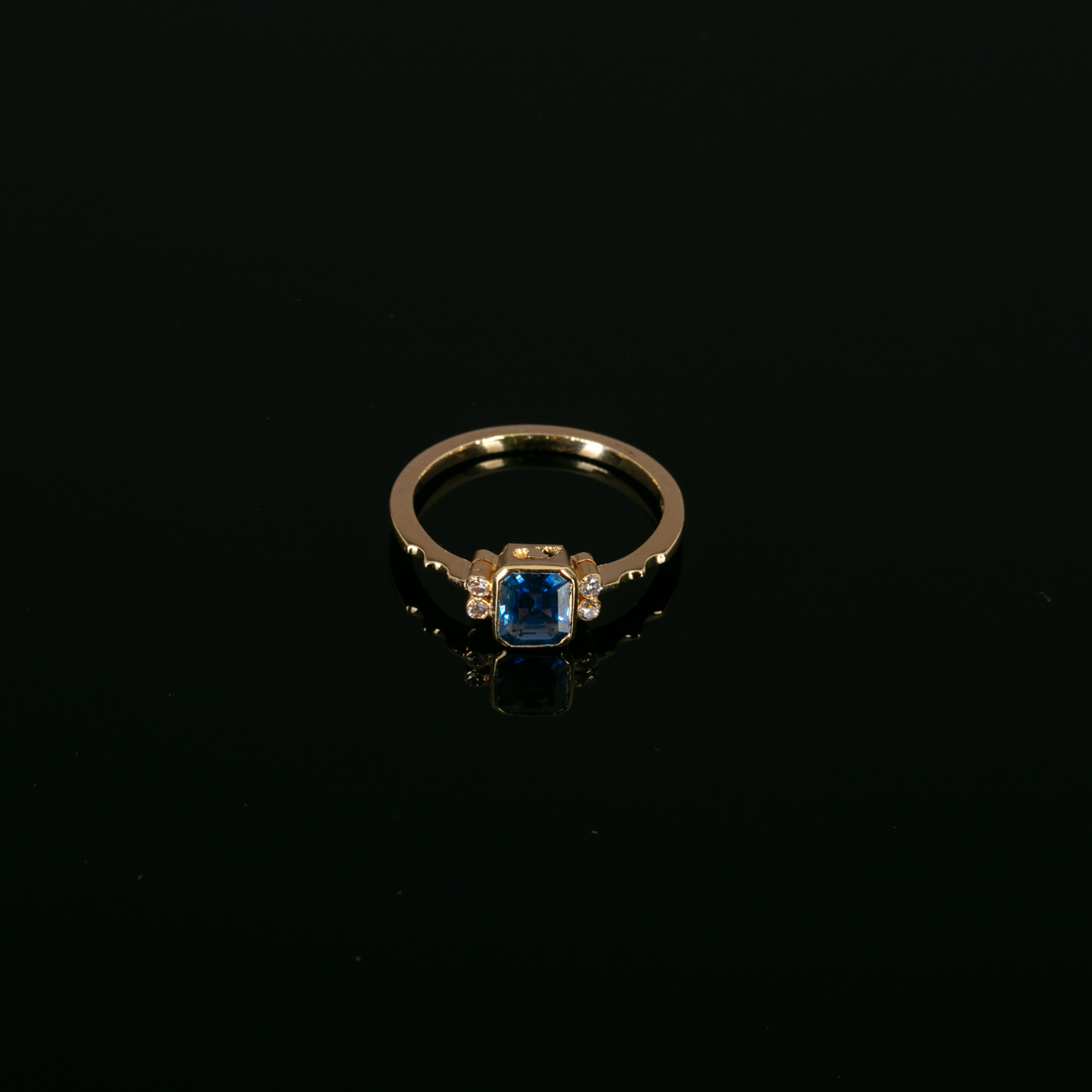 Em ouro português de 18Kt., cravejado com safira e quatro diamantes talhe brilhante. Sinais de uso.