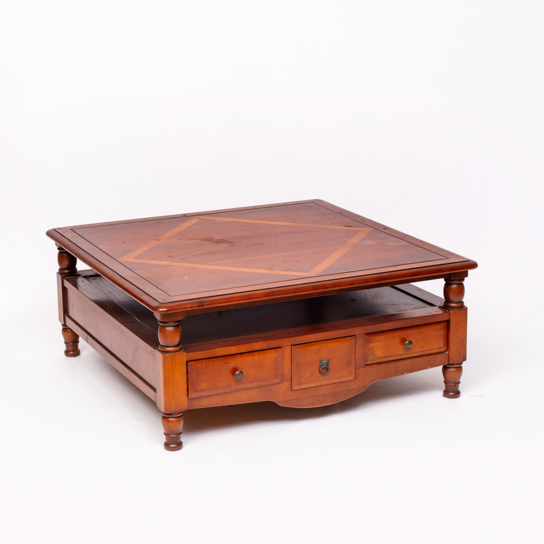Folheada a mogno e outras madeiras com embutido losango, de três gavetas, elementos torneados. Defeitos e pequenas falhas.