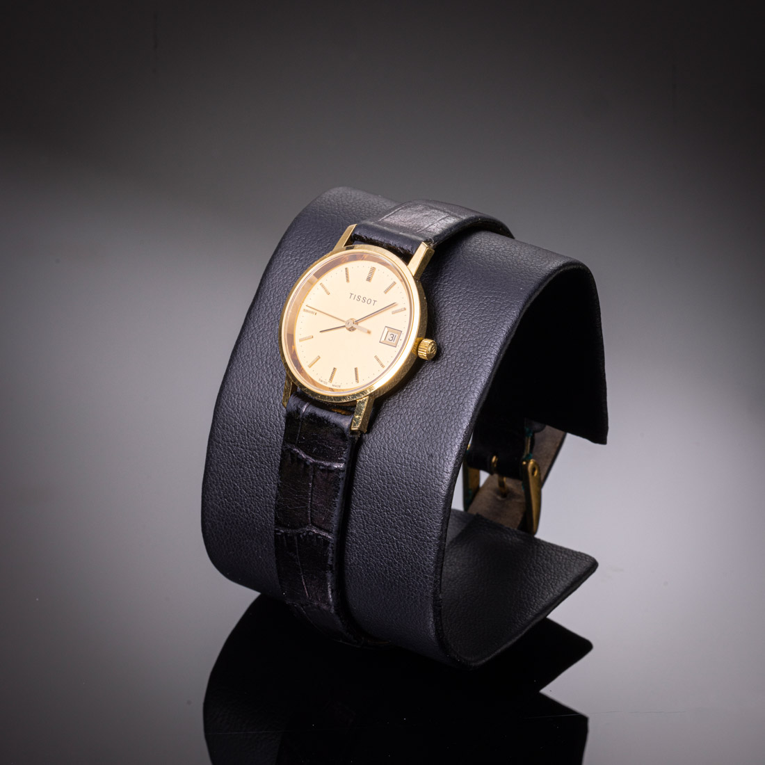 Caixa em ouro de 18Kt., mostrador dourado, movimento a quartzo. Suíço. Em marcha.