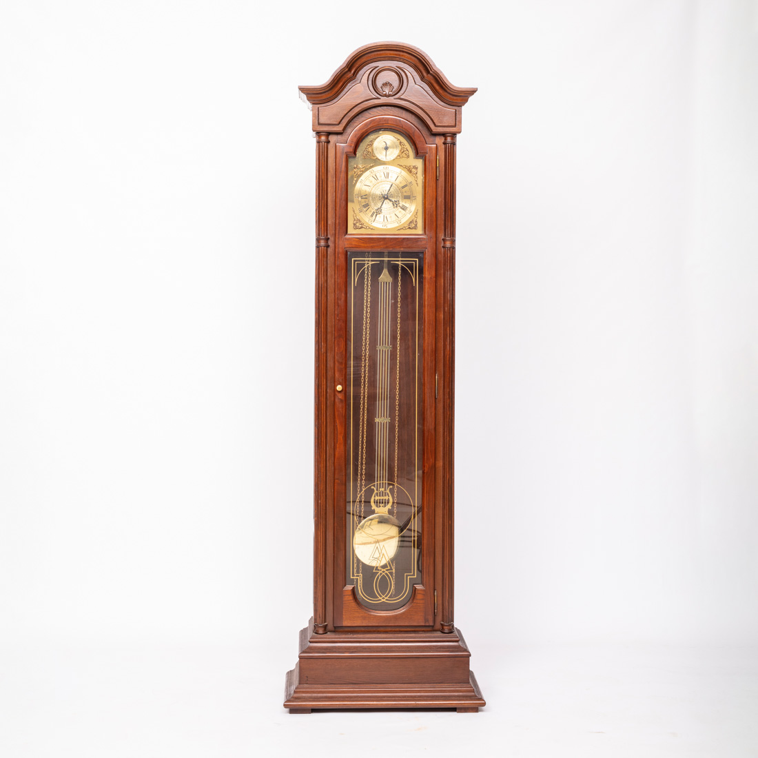Da Boa Reguladora. Caixa em castanho e outras madeiras, mostrador em metal dourado com elementos vegetalistas e numeração romana. Não testado. Pequenos defeitos.