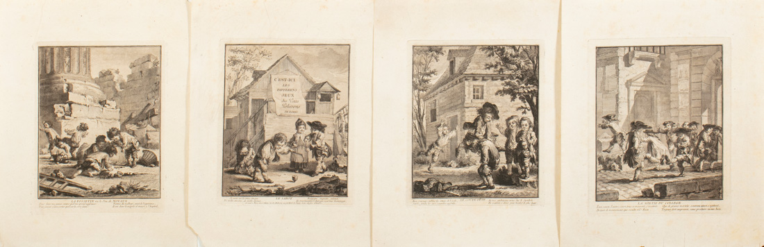 Do Séc. XVIII (cerca de 1770), sobre papel vergé, representando crianças parisienses brincando, da autoria de Augustin de Saint-Aubin (1736-1809). Não emolduradas. Pequenas falhas e picos de acidez.