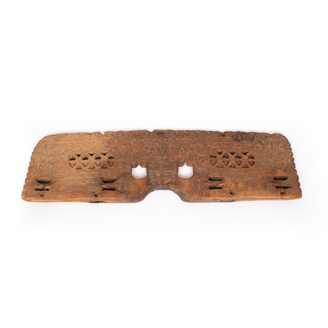 Em madeira entalhada e vazada, vestígios de policromia, decorada com padrões geométricos e vegetalistas. Séc. XIX. Falhas, defeitos e vestígios xilófagos.
