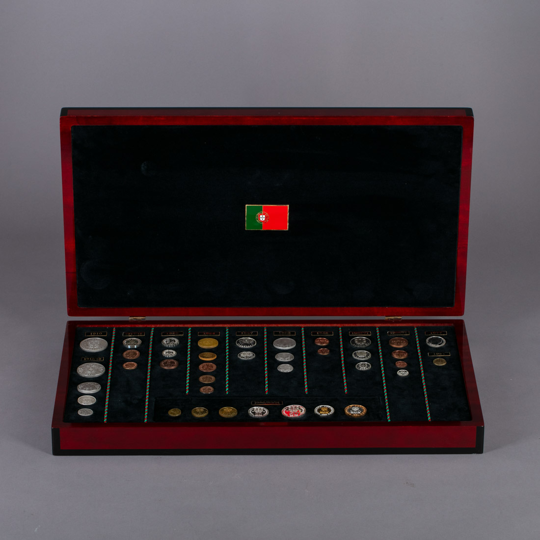Em prata portuguesa contraste águia (pós 1985) de 999, colecção composta por 39 moedas cunhadas em prata reproduzindo moedas que já circularam no nosso País. Edição limitada e exclusiva das Colecções Philae. Com caixa original. Peso Aprox.: 615 g. Dim.:1,5 a 3,7 cm.