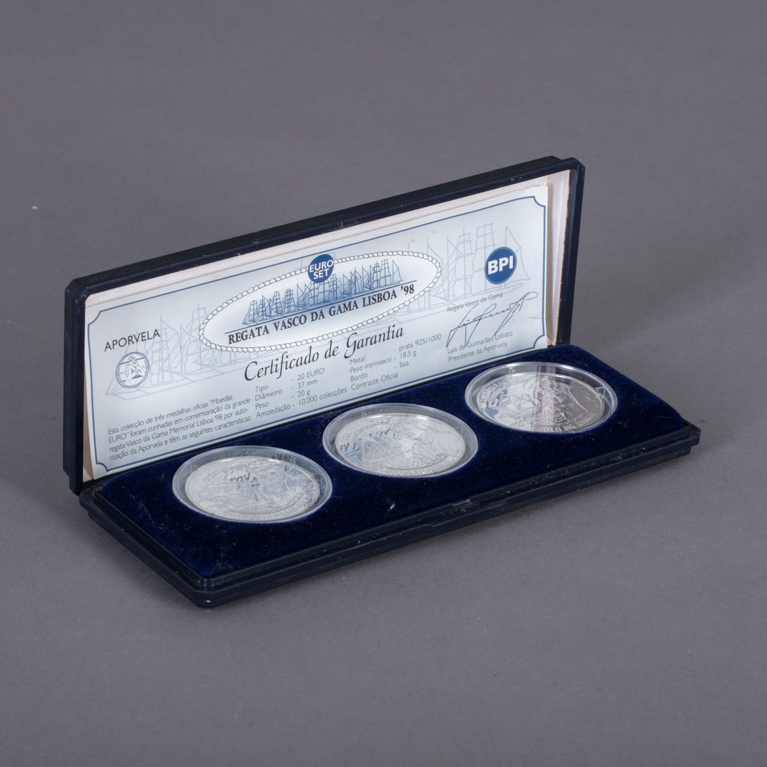 Três moedas de 20,00 euros, em prata portuguesa contraste águia (pós 1985) de 925. Euro Set - BPI. Em estojo e certificado de garantia.