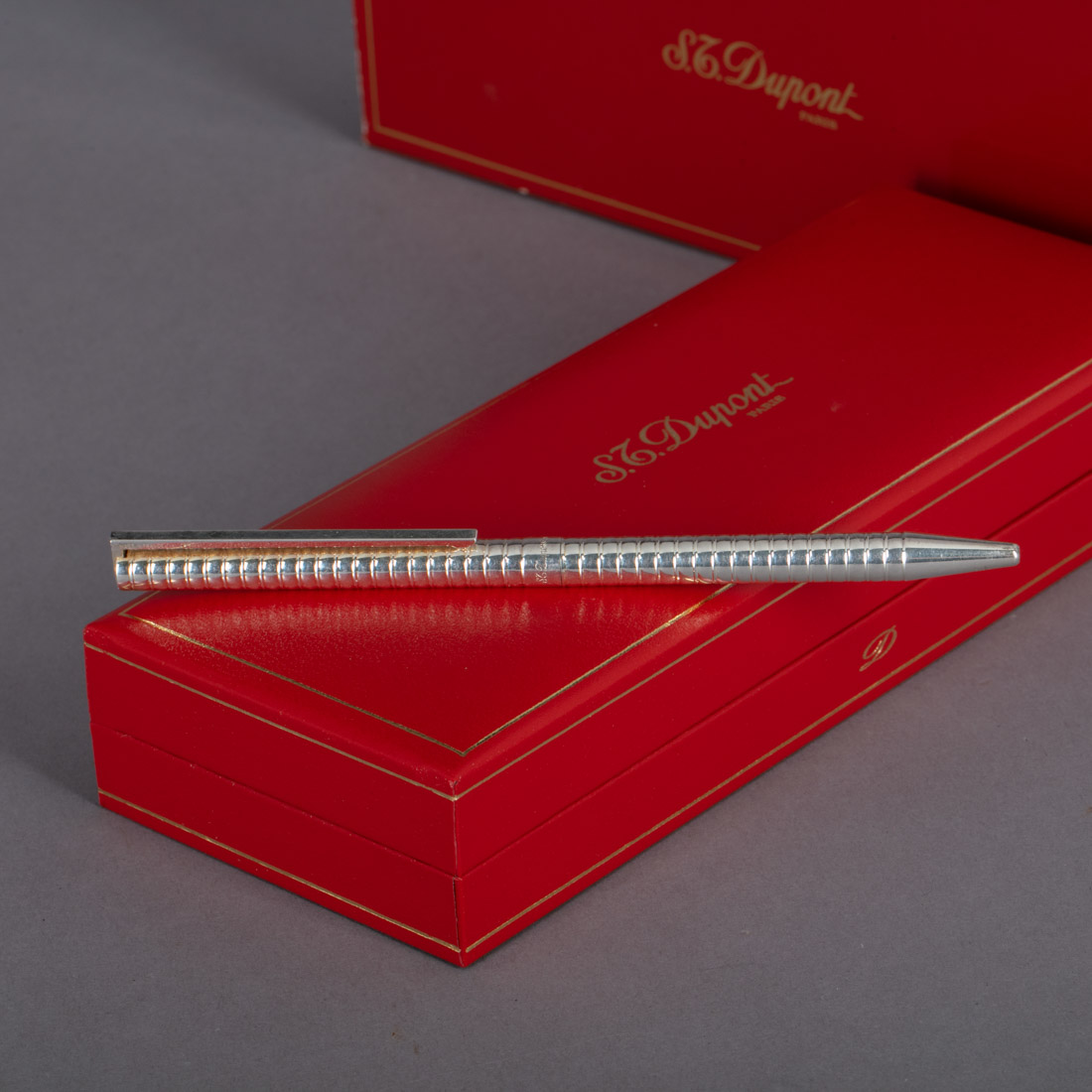Em plaqué de prata, marcado S.T.Dupont. Com estojo, caixa e documentos originais. Sinais de uso.