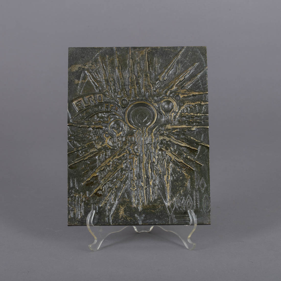Em ferro, trabalho modernista em relevo, assinada Mário Silva. Com Caixa. Sinais de uso.