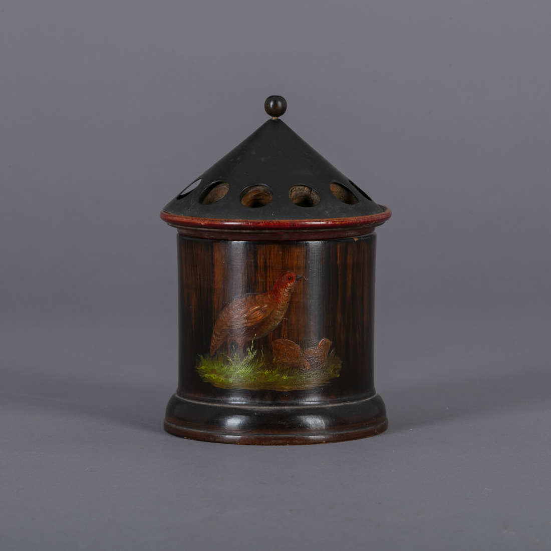 Em madeira pintada, decoração policromada com codornizes, parte superior em metal lacado a negro. Pequenos defeitos.