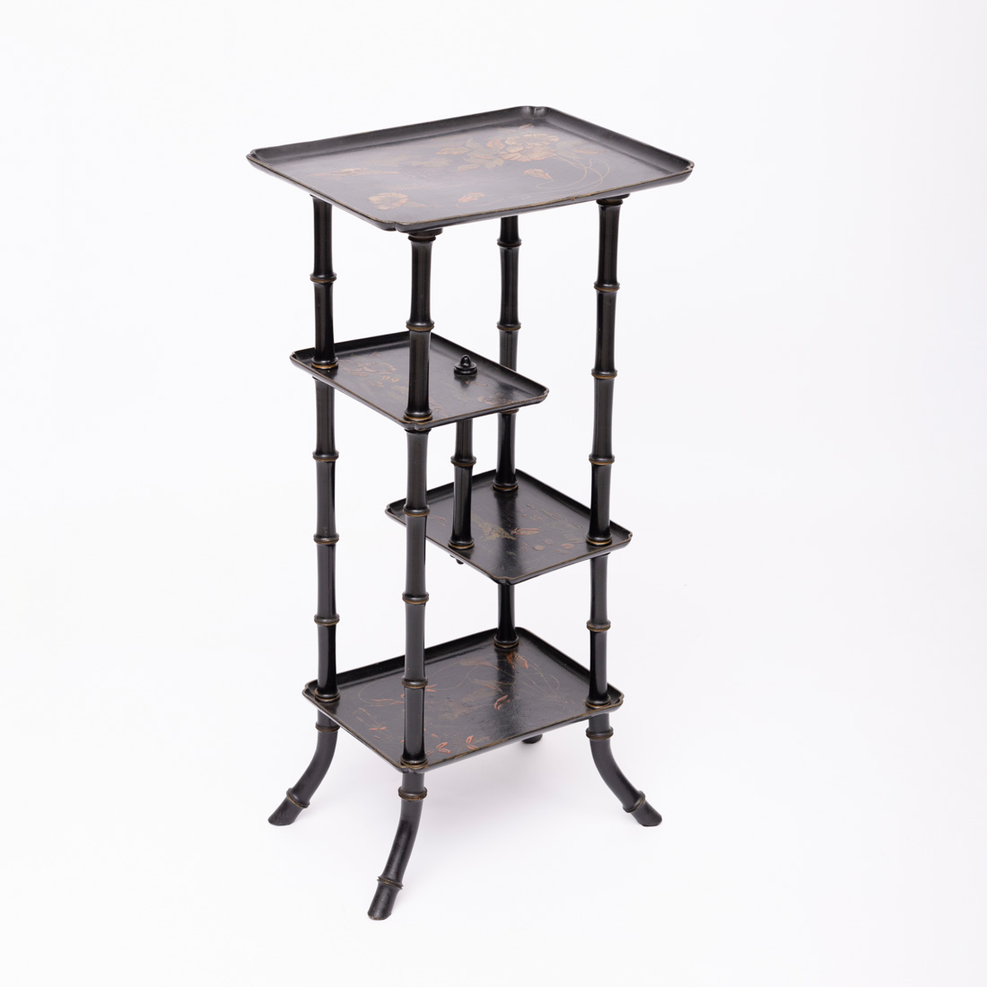 Em madeira lacada a negro, decoração policromada e dourada "flores pássaros", de quatro níveis, pernas simulando bambu. Pequenos defeitos.
