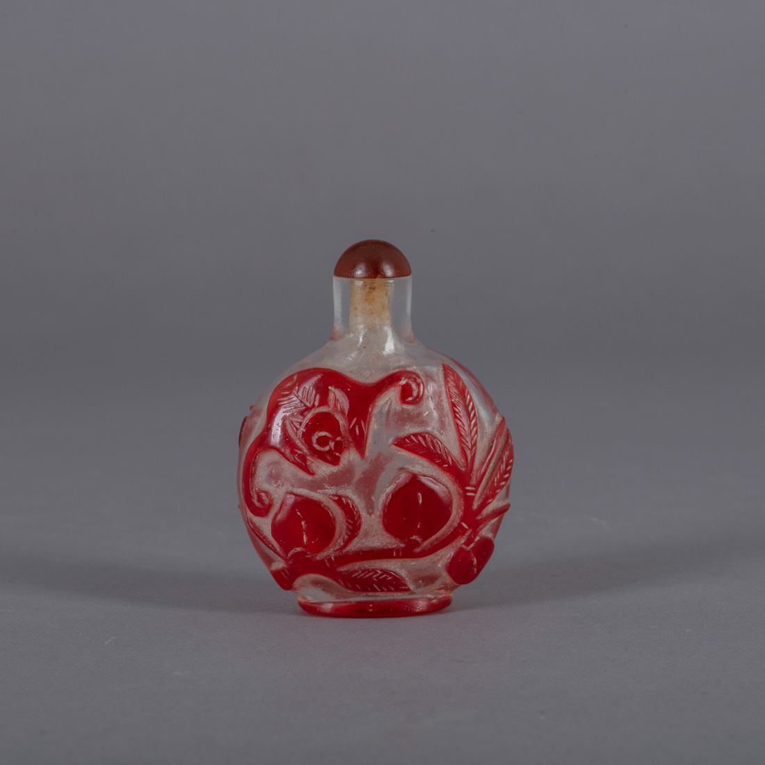 Em vidro bicolor, decoração relevada "frutos e morcegos". Chinês. Sinais de uso, pequeno defeito na tampa.