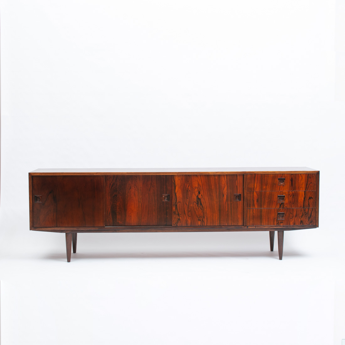 Folheado a pau santo e outras madeiras, de três portas de correr e três gavetas. Europa, Séc. XX (anos 60). Sinais de uso.