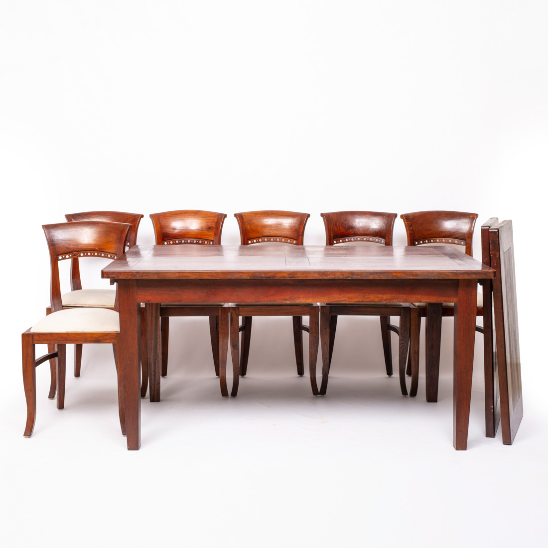 Em madeira escurecida, com duas tábuas de extensão, cadeiras em diferentes madeiras, tabela curva com friso vazado, assentos estofados. Sinais de uso e pequenos defeitos.