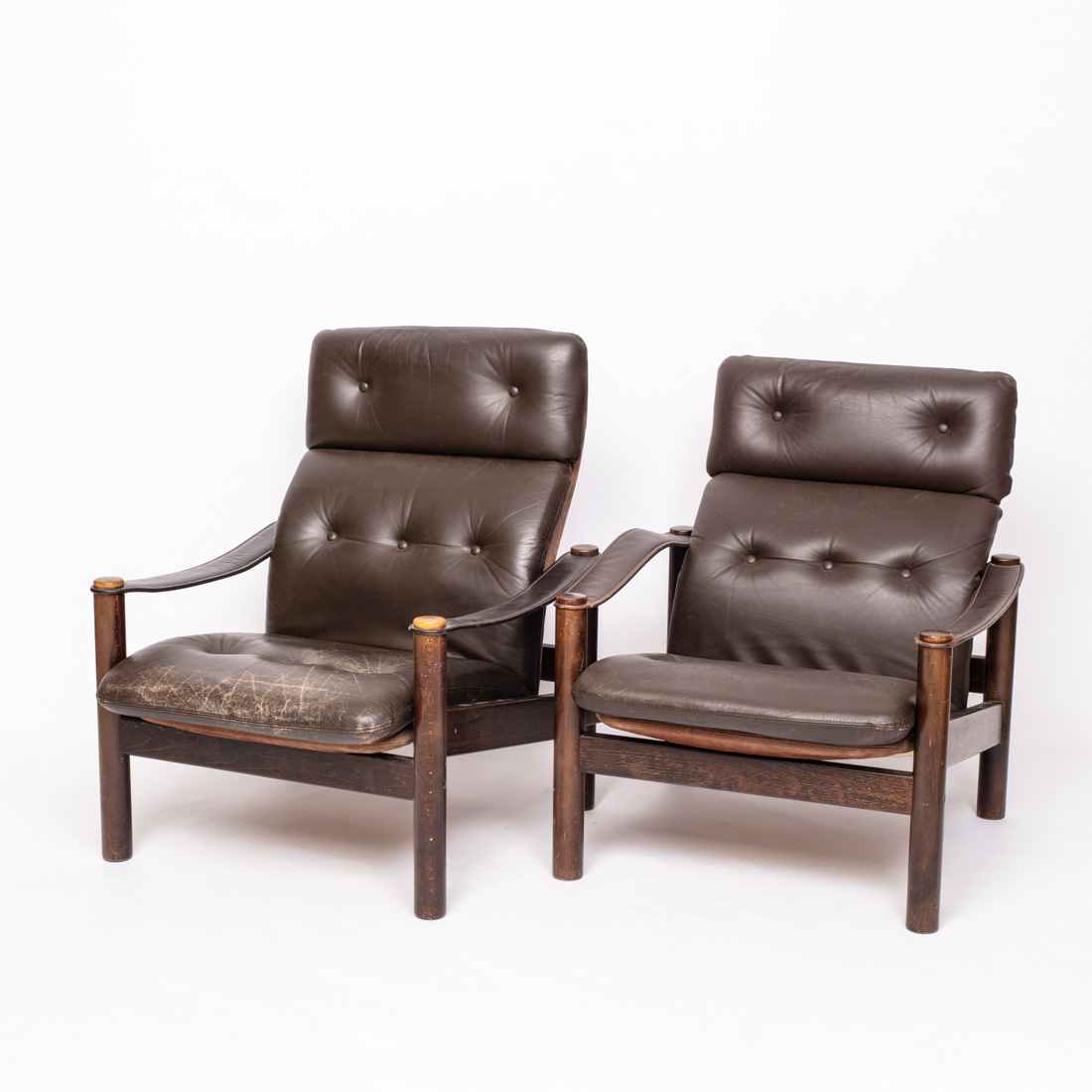 Em madeira escurecida, costas, assentos e apoios de braços em pele castanha. Europa, Séc. XX. Sinais de uso, pequenos defeitos.