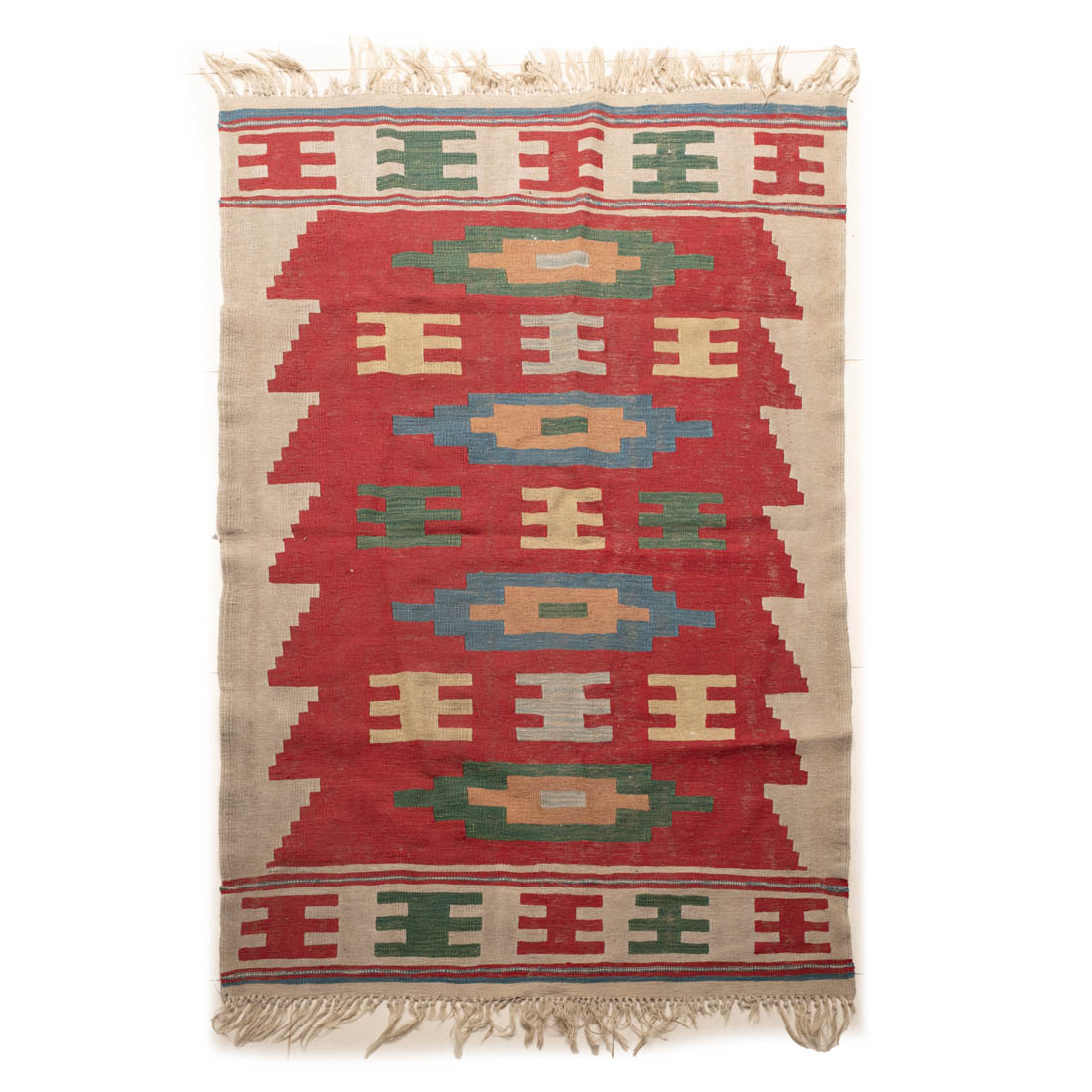Em lã, decoração policromada com elementos geométricos. Manchas e pequenos defeitos.