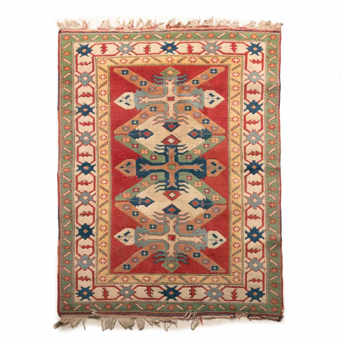 Em lã, decoração policromada com elementos geométricos. Falhas e defeitos.
