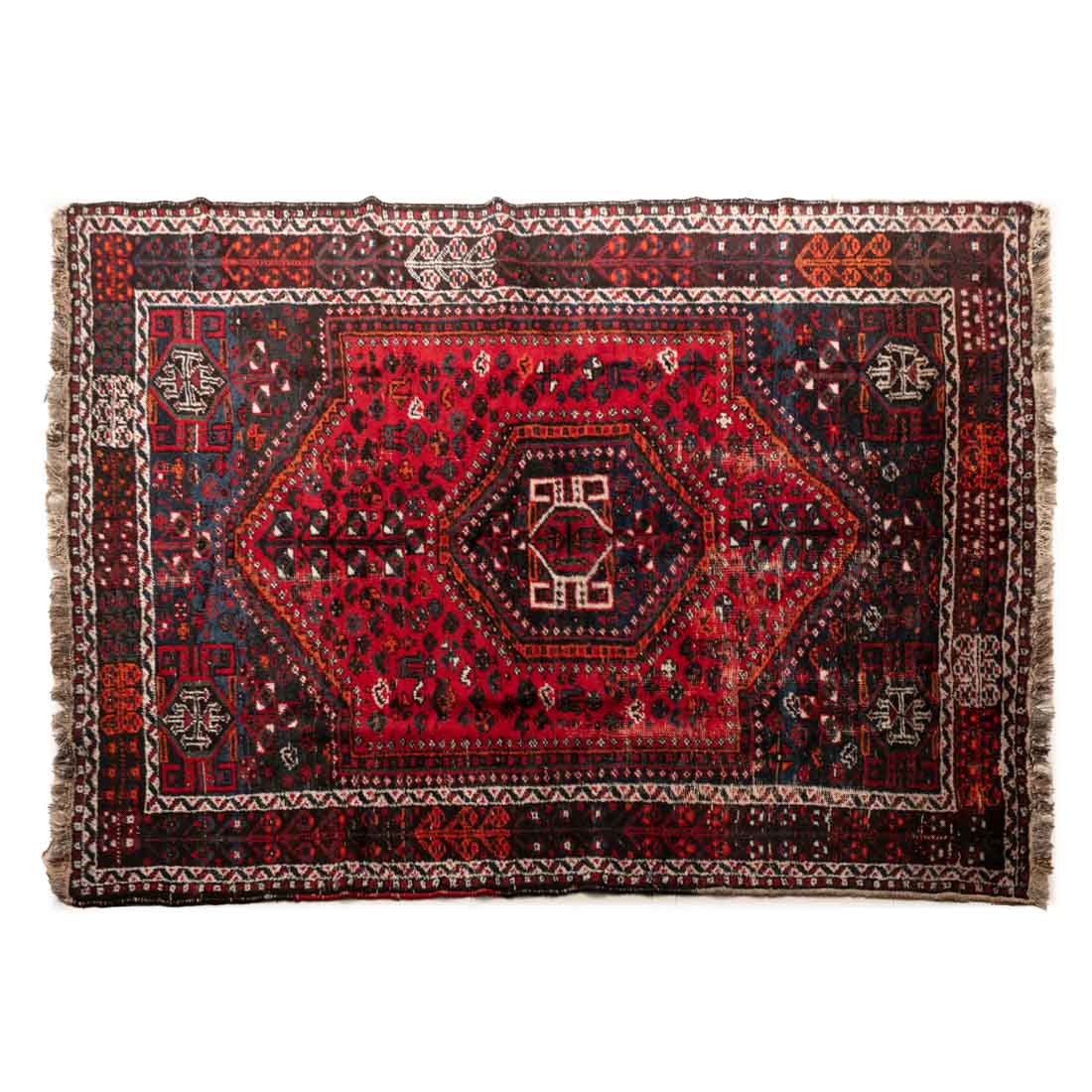 Em lã, de tons policromos com motivos florais, animais e elementos geométricos. Sinais de uso, desgaste.