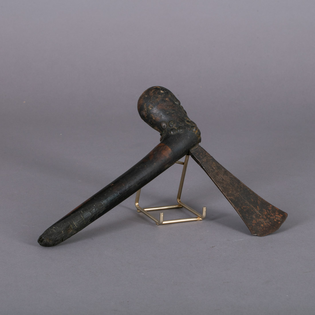 Em ferro decorado com gravados, madeira e pregaria. Africa. Falhas e pequenos defeitos.