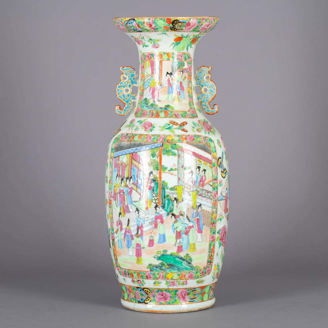 Em porcelana da China, Séc. XIX, decoração "Mandarim" policromada e dourada, reservas com figuras orientais, frutos e flores. Asas recortadas em forma de animais estilizados. Com elemento que permite adaptação a candeeiro. Sinais de uso, ligeiro desgaste.Dim: 61 cm; Total: 109 cm.