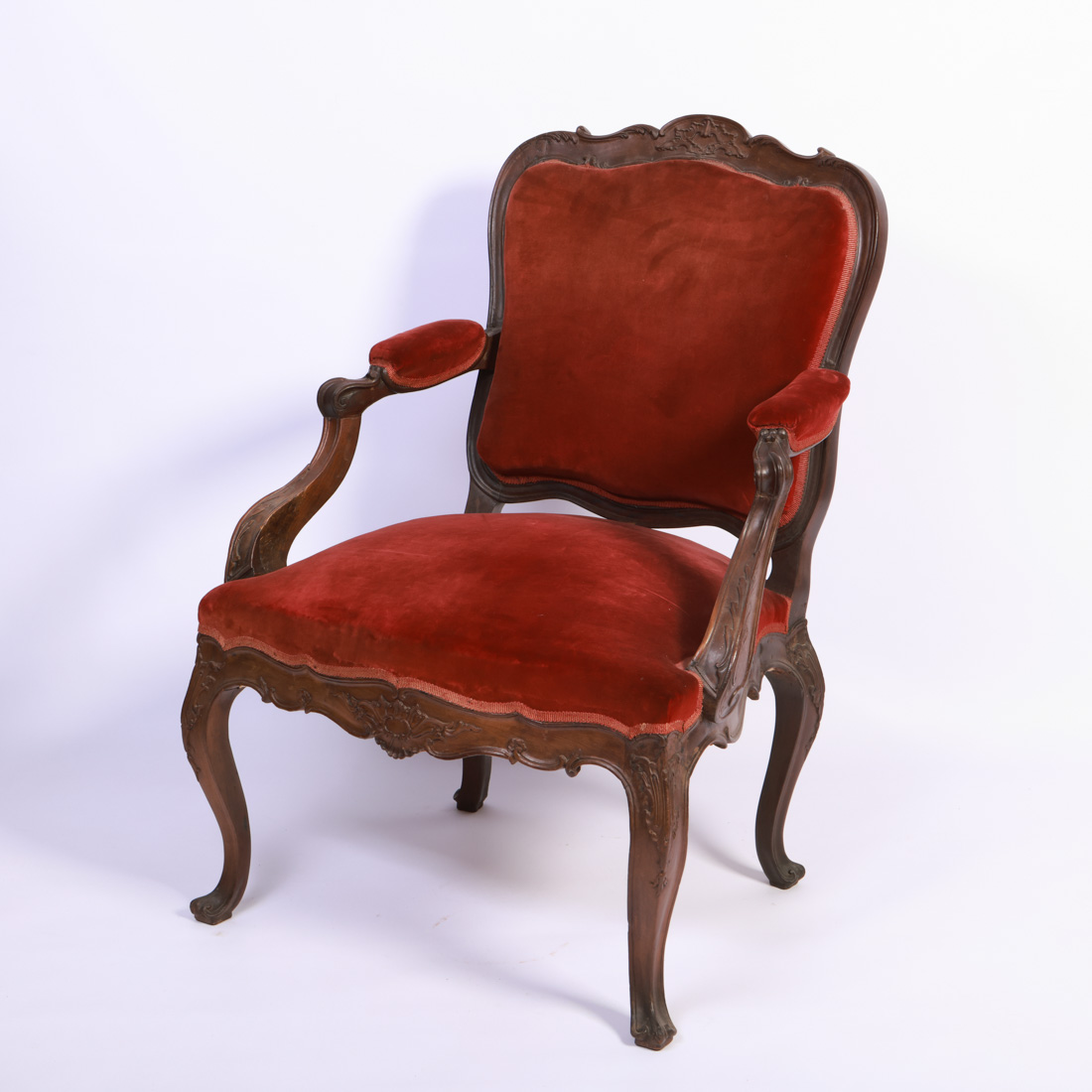Em Gonçalo Alves com entalhamentos, costas, assentos e apoios de braços estofados a veludo vermelho. Pequenos defeitos.