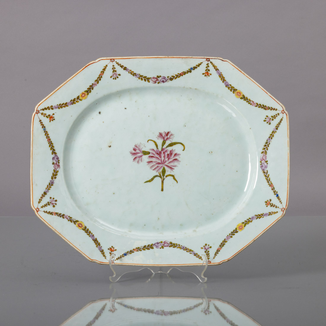 Em porcelana da China Companhia das Índias, Séc. XVIII, decoração policromada com grinaldas e flores. Sinais de uso.