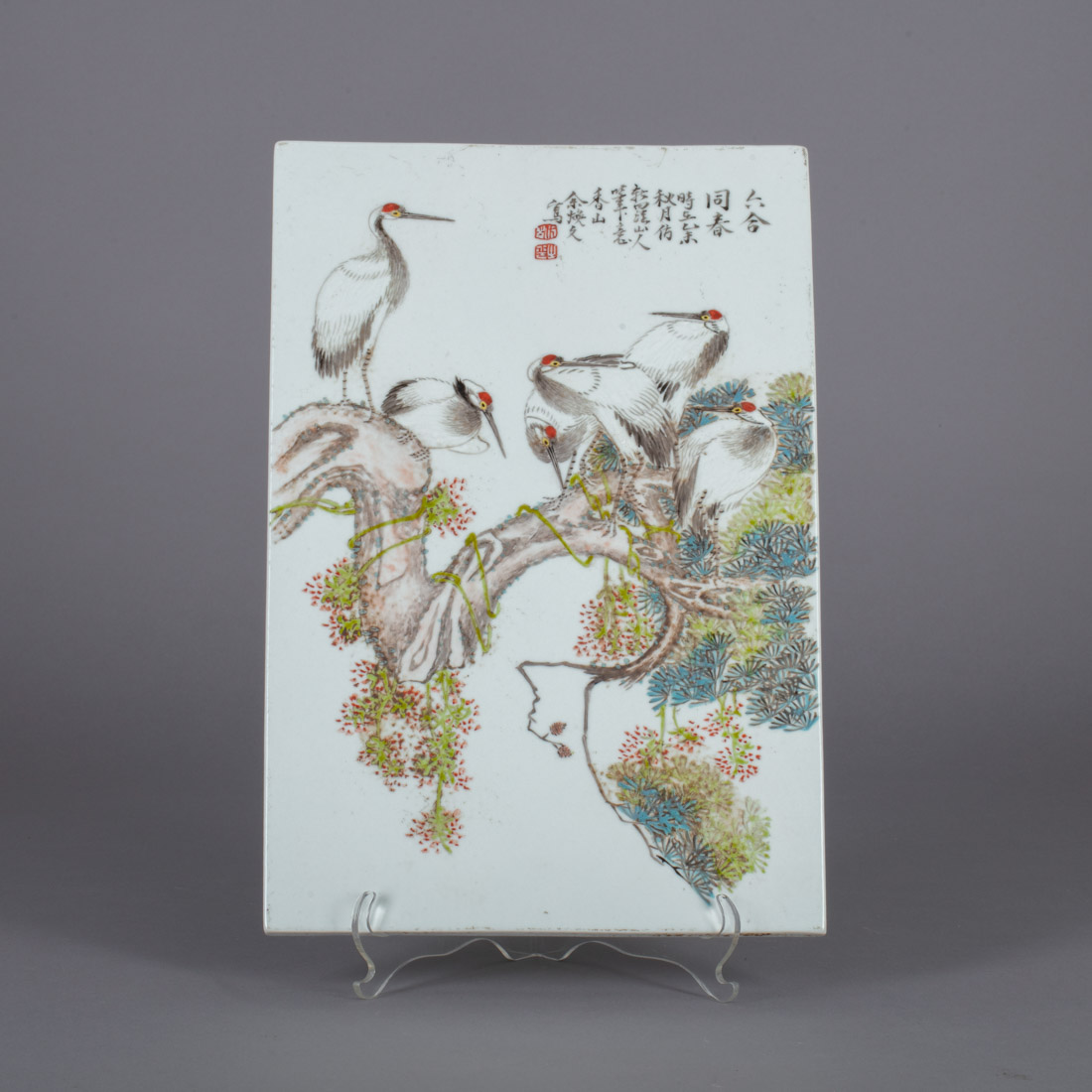 Em porcelana da China, decoração policromada com arvoredo e grous, caracteres. Sinais de uso.