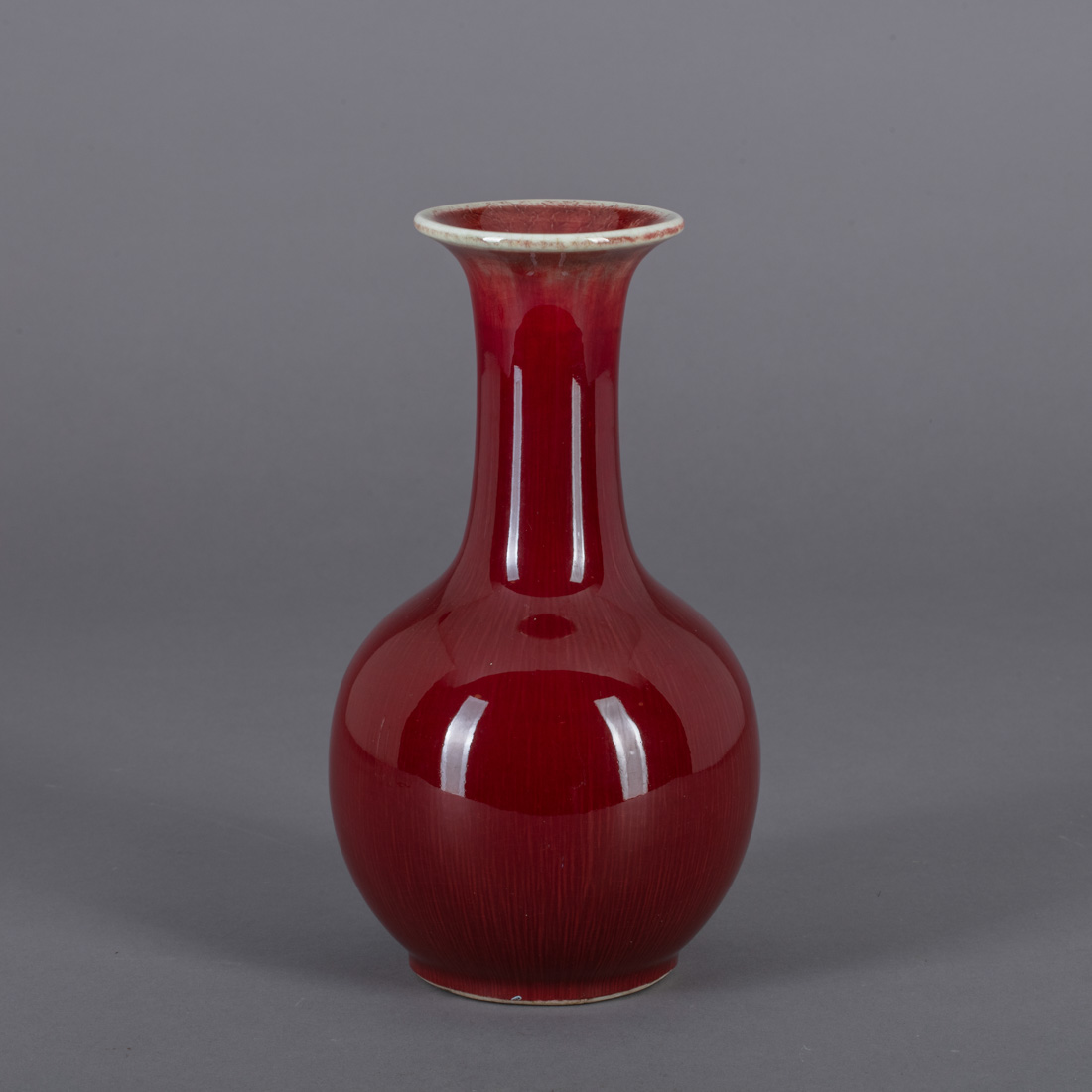 Em porcelana da China, decoração monocroma "sangue de boi". Sinais de uso.