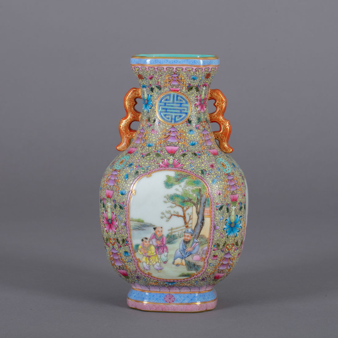 Em porcelana da China, decoração policromada e dourada "flores", reservas com paisagens e figuras, pegas relevadas. Marcada. Sinais de uso.