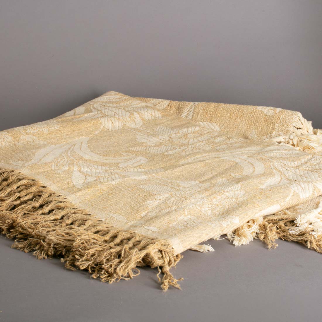 Em linho adamascado em tons bege. Sinais de uso e pequenas manchas de estar guardada.