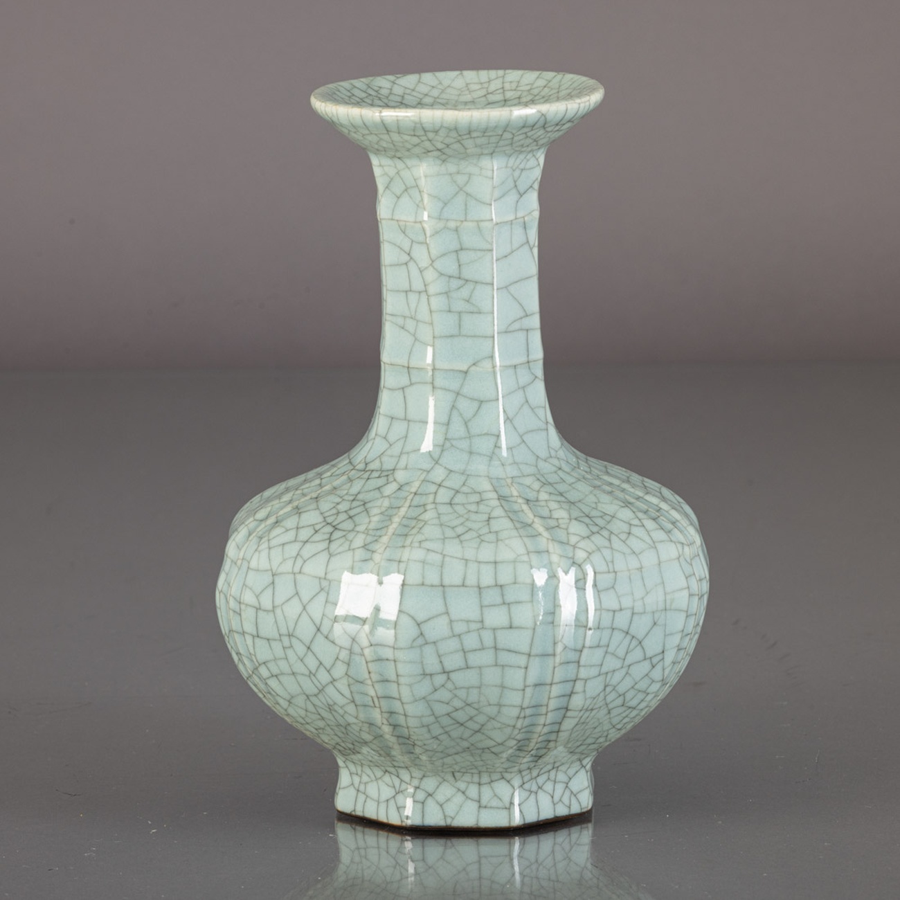Em cerâmica chinesa vidrada, decoração "craquelé" sobre fundo Celadon. Marcada. Sinais de uso.
