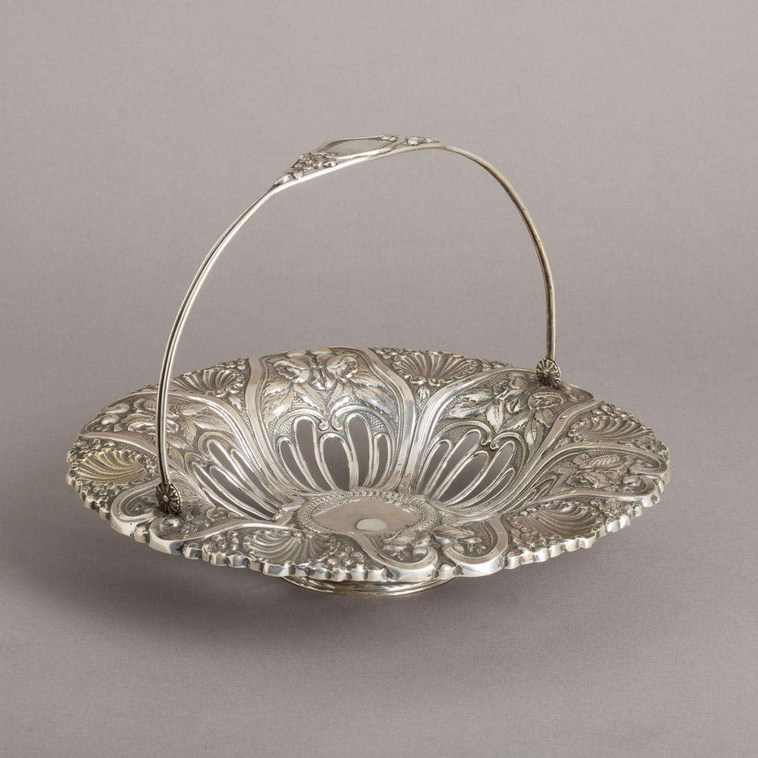 Em prata portuguesa contraste águia (1938-1984) de 833, decoração relevada e vazada "enrolamentos, flores e concheados". Pequenas falhas e pequenos restauros.