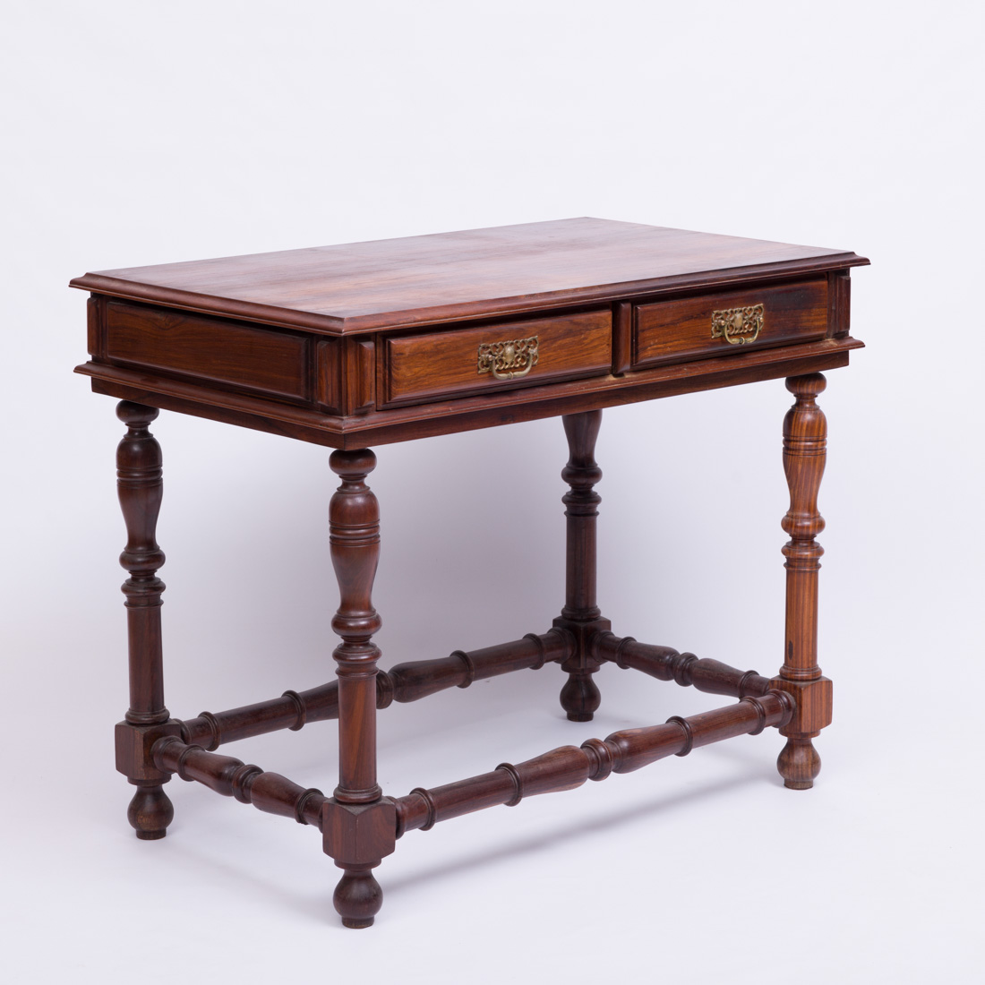 Em pau santo e outras madeiras, de duas gavetas, pernas e travejamentos torneados. Restauros, pequenos defeitos.