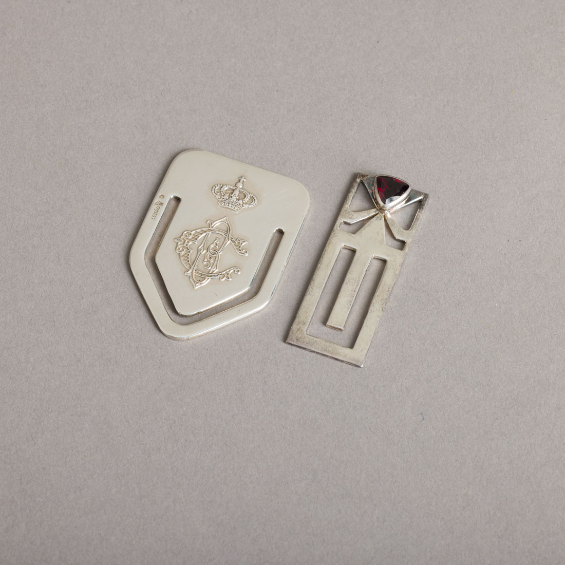 Um em prata portuguesa contraste águia (pós 1985) de 925, marcada Leitão, decoração relevada "Monograma com coroa real", outro em prata inglesa de 925, marcas de garantia da cidade de Londres cravejado com pedra. Sinais de uso.